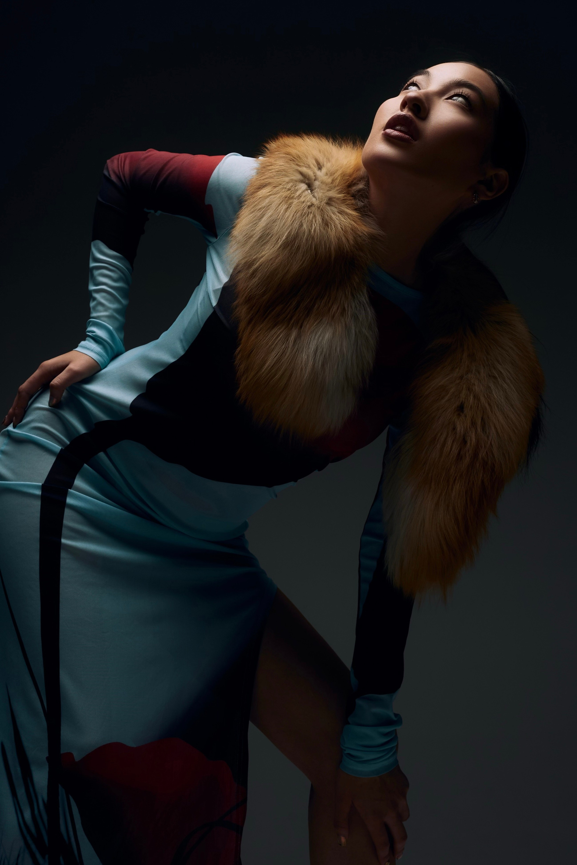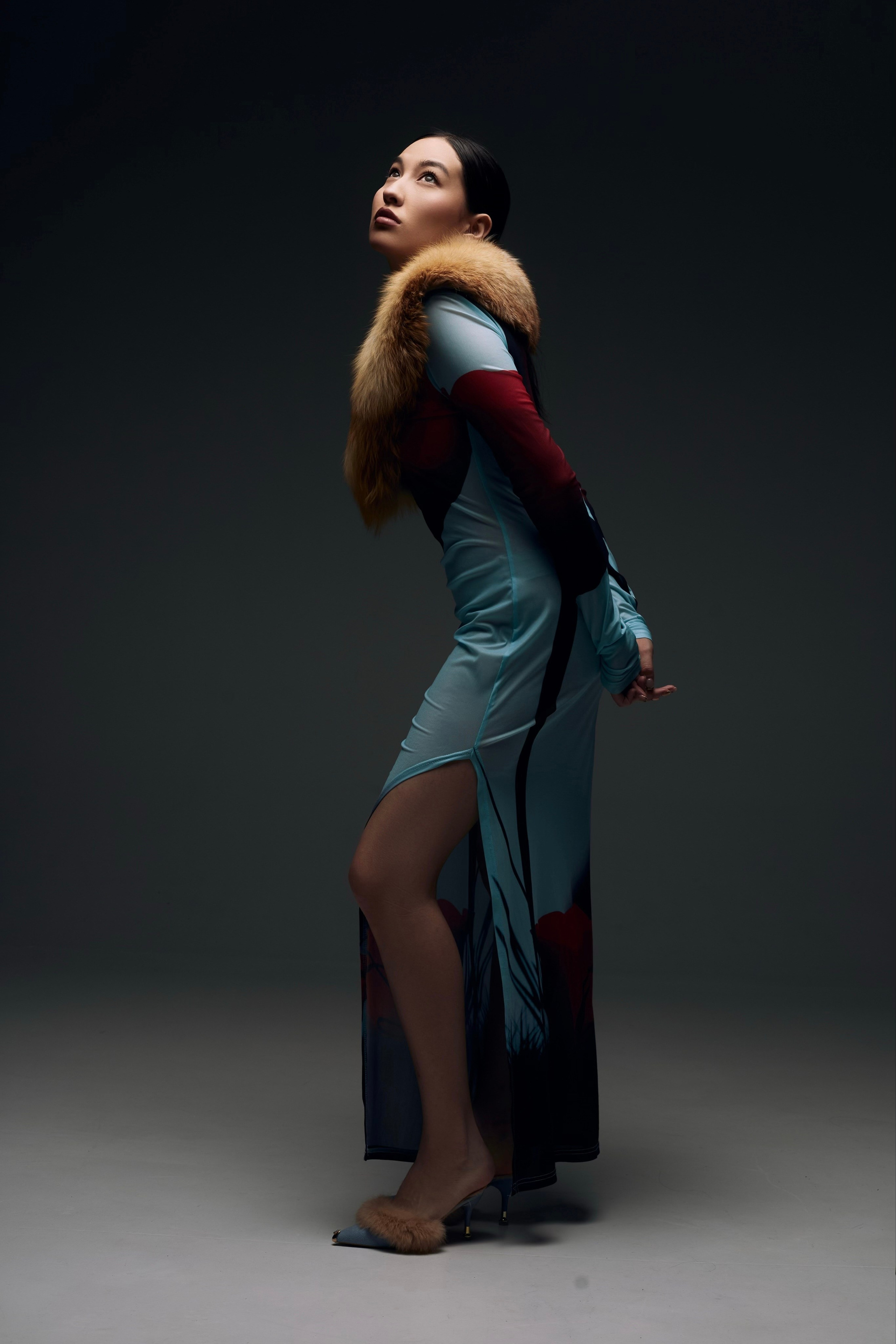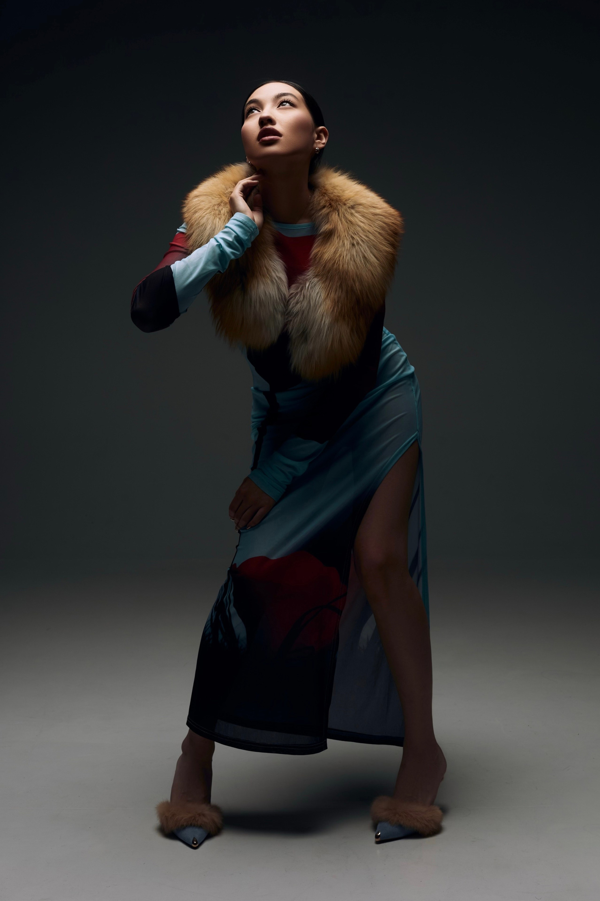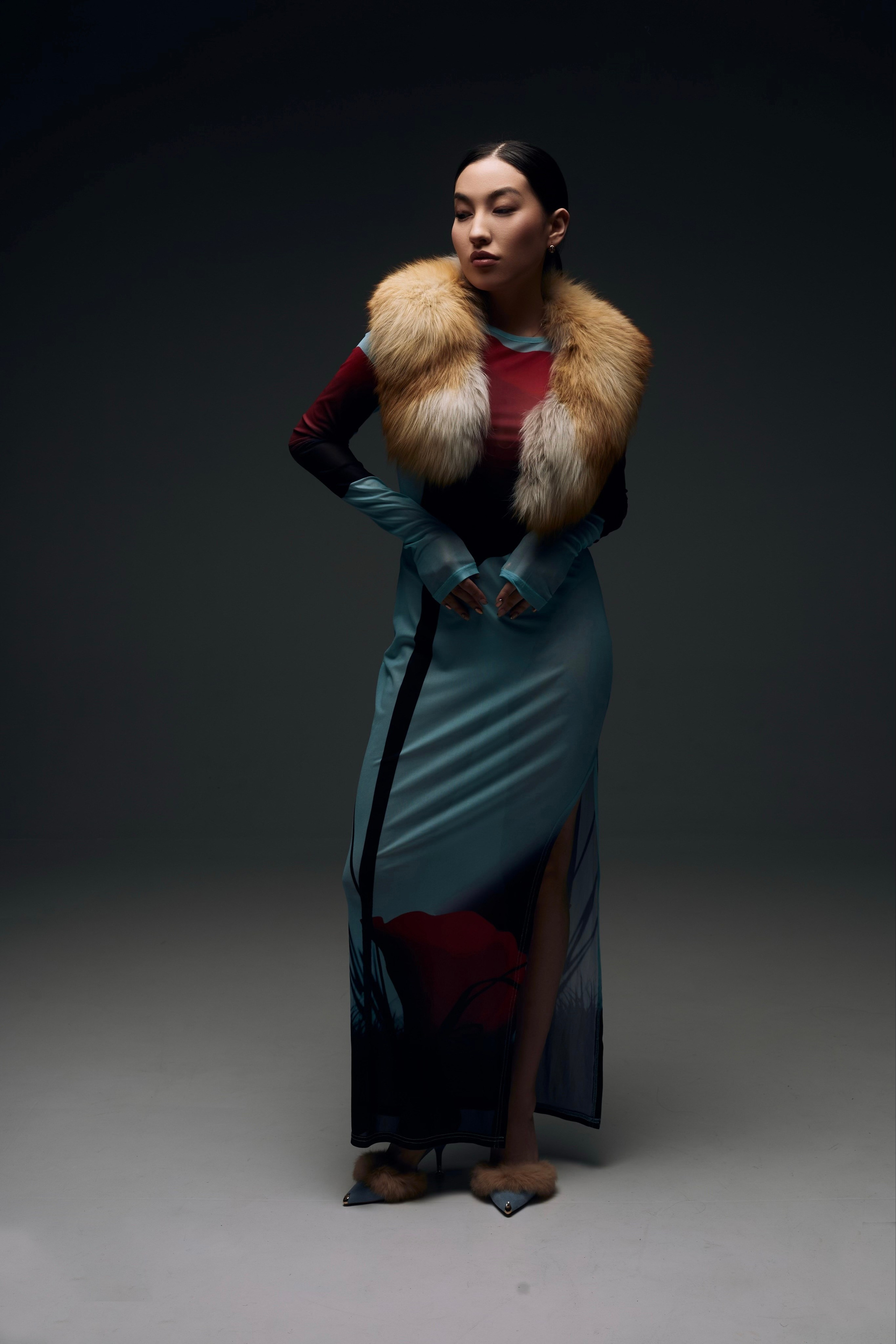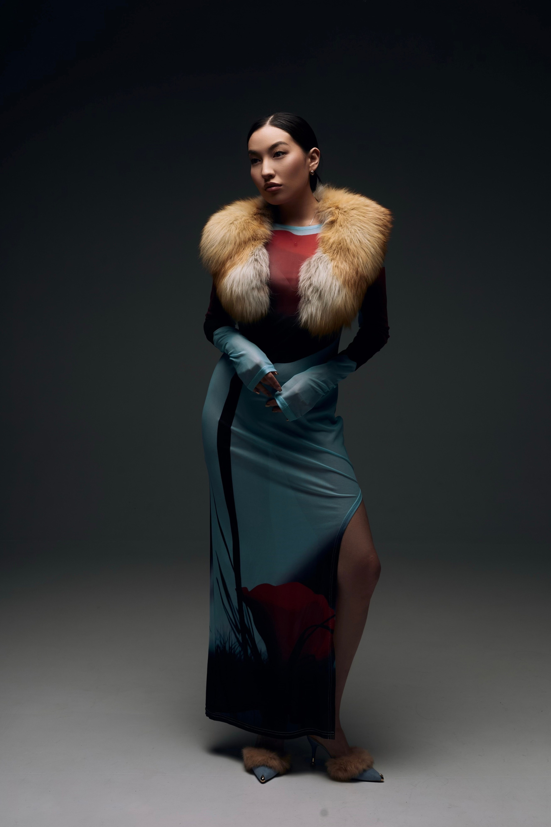 Образ для съемки собирались в ренте, которые соседничает с фотостудией. Я сначала увидела платье, потом мюли и поняла, что образ прекрасно дополнит меховуся) Образ прекрасно подходит по вайбу модели и типажу, ведь она у нас Якутяночка!